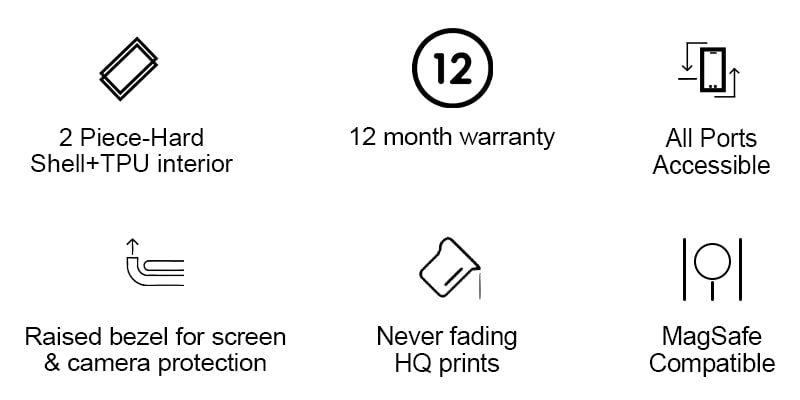 Though nothing's indestructible, our cases are built to endure daily wear and tear, ensuring the prints stay crisp and vibrant, resistant to fading and peeling. Demonstrating our commitment to your satisfaction, Snap, Tough & MagSafe cases come with a 12-month warranty, and Snap cases are backed by a 6-month guarantee.